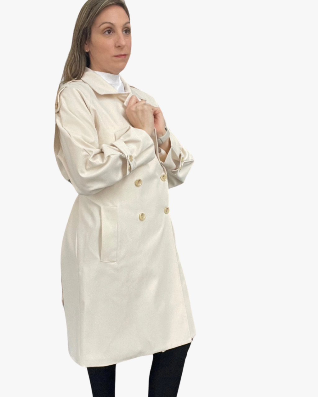 Una pieza atemporal y con carácter. Su corte oversize en gabardina de calidad le aporta presencia y comodidad, mientras que los detalles —como las presillas regulables en las mangas, la tira en los hombros y el lazo en la cintura— lo hacen único. Pensado para quienes valoran el diseño desde todos los ángulos.